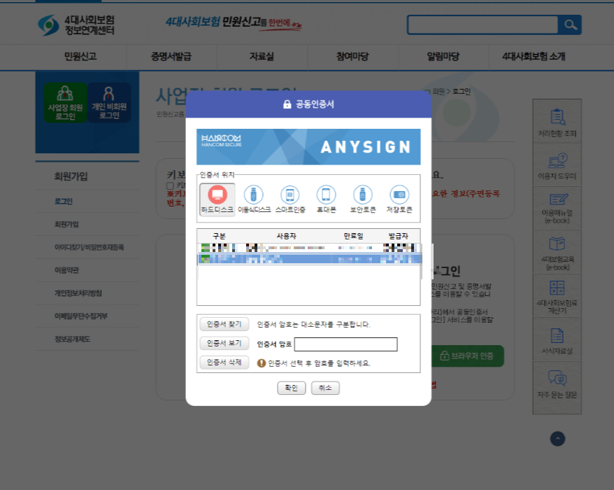 사업장 회원 로그인으로 저는 발급받아보려고 하는데요. 해당하시는 사업장 혹은 개인으로 발급이 가능하기 때문에 일단 로그인 준비에 필요한 회원가입 혹은 공동 인증서를 발급해두시면 편리한 이용에 도움이 됩니다. 공동 인증서로 로그인하고