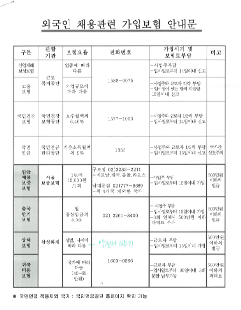 보험료는 직원 본인이 부담하는 건데 사실 외국인 근로자가 있으면 회사에서 대부분 처리해 주고 있습니다. 한국말이 서툴러서 통화를 하기도 어렵고 상해보험 가입이 되어있지 않다고 해서 저희 회사에 페널티를 주는 것은 아닙니다.